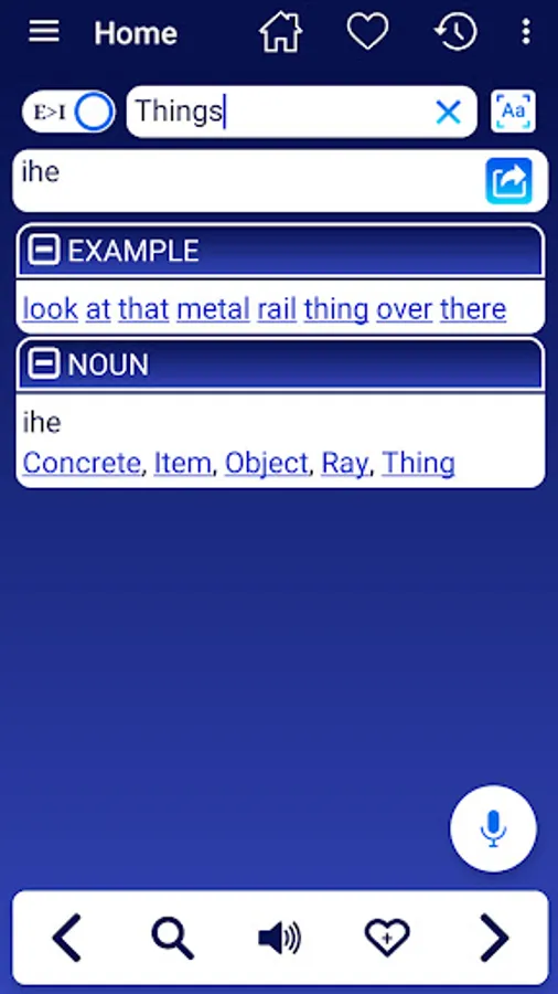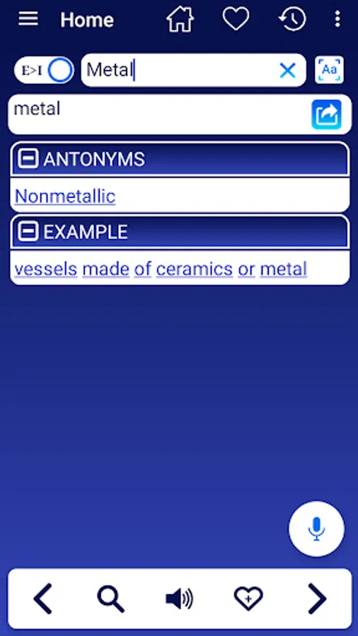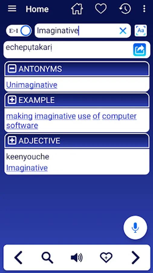 Search History, Store Favorite, Display Word Of the Day. List of Synonyms and Antonyms with details English description. Searching words through voice, Pronunciation of English, Detecting typed language automatically.