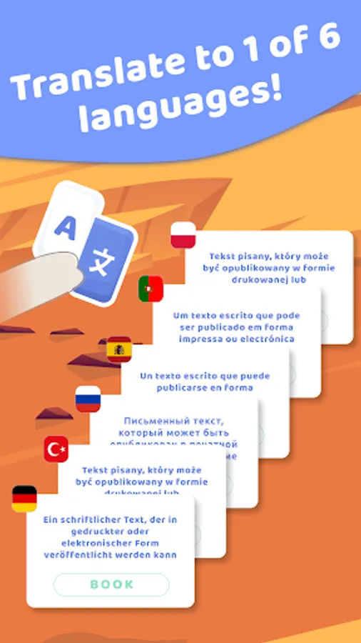 The entire word puzzle game is based on the cat-traveler, who learns English. In the very beginning you choose 1 of 6 languages (Spanish, Russian, German, Portuguese, Polish, and Turkish) to which the word definition can be translated. If you have challenges with word search, just use a translation hint and understand the meaning.