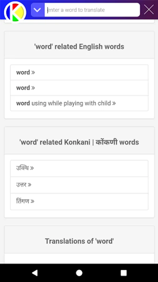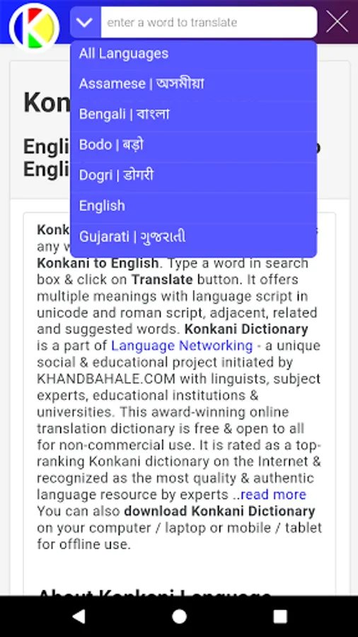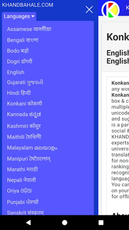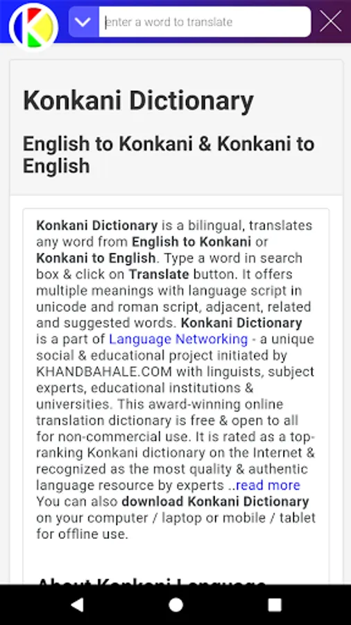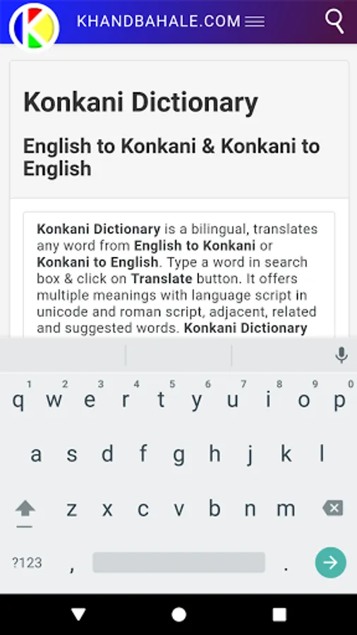 English to Konkani Dictionary is an Android Offline App that includes an extensive vocabulary of 1,00,000+ words along with translated Konkani meanings. more at https://www.khandbahale.com/konkani