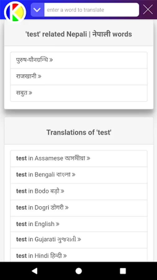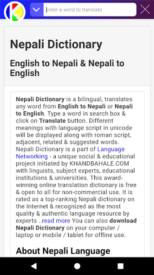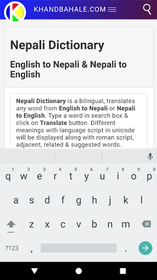 English to Nepali Dictionary is an Android App that includes an extensive vocabulary of 1,00,000+ words along with translated Nepali meanings. more at https://www.khandbahale.com/nepali