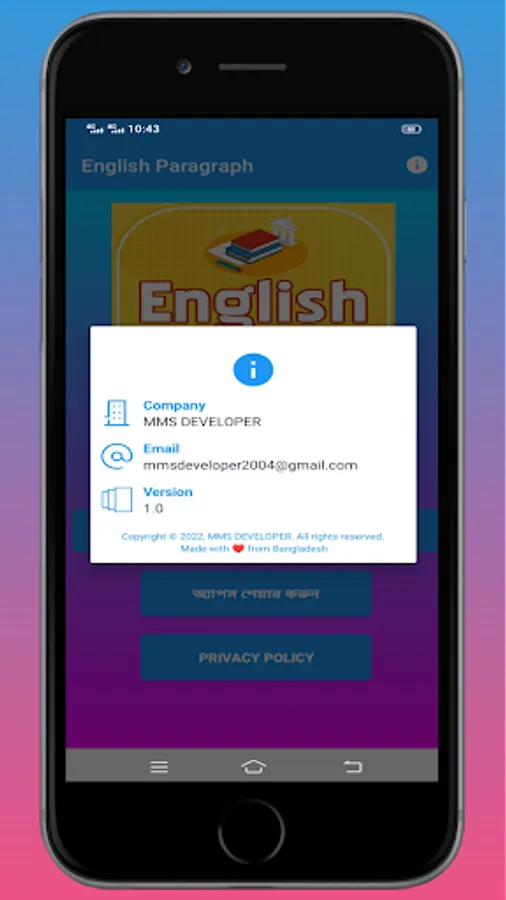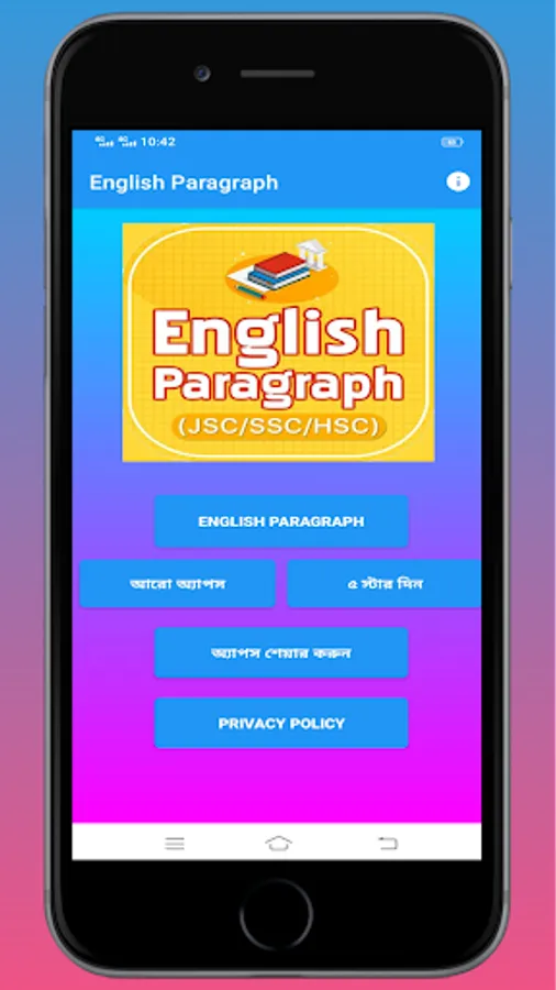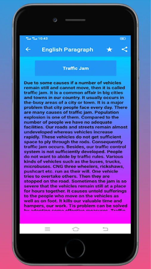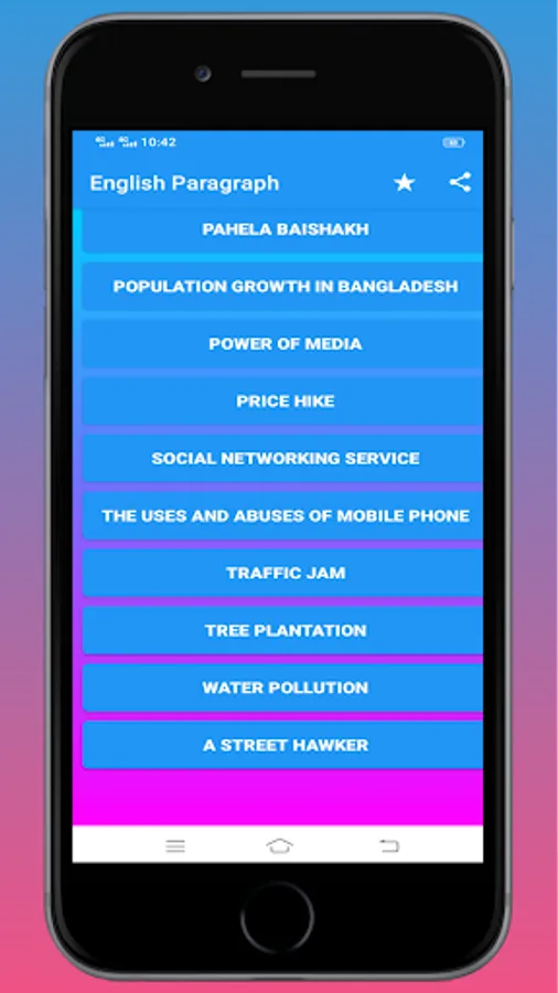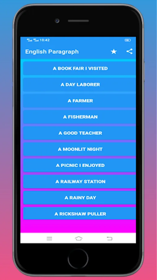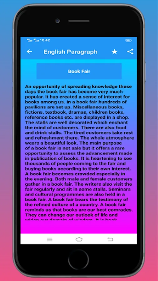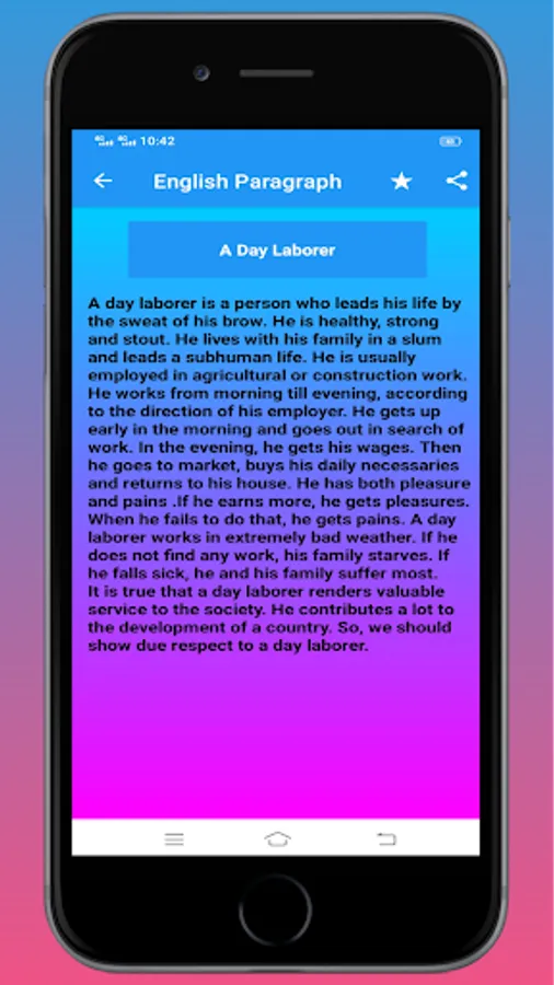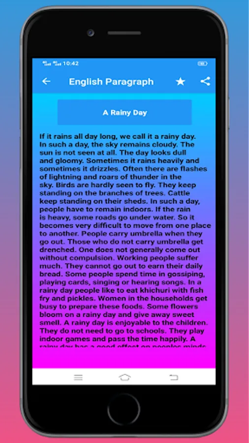 There are a lot of app in play store. but this app is more richest in content. In this application have more than three hundred seventy five English paragraph. At present each and every school and college there are a lot of English writing. So, paragraph also one type of English writing. To get all types of English paragraph you should keep this android application. So, please if you think this app is best for your, than don't forget to share with your friends and family.
