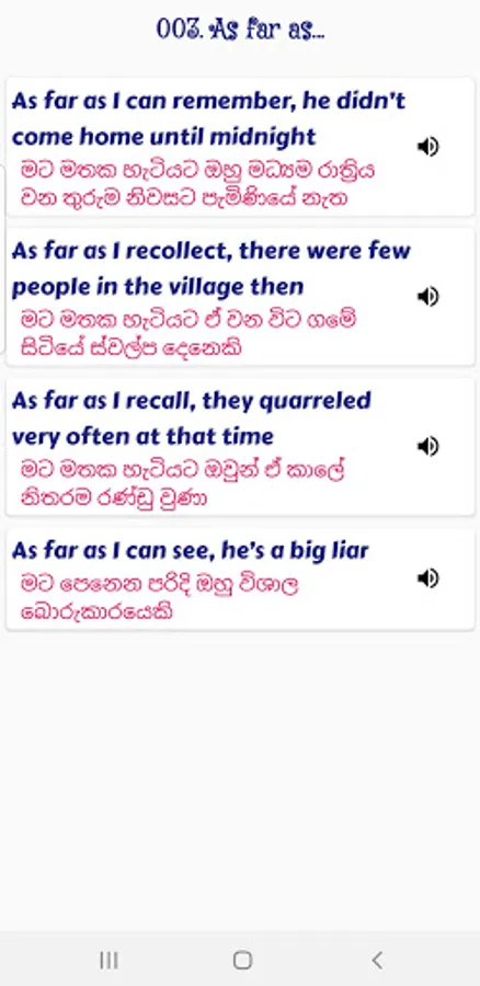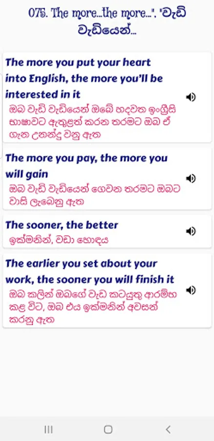 Also English to Sinhala 3000 words app includes very useful English phrases. These are not just phrases but you can use them with your spoken English no matter whether it is formal or informal. This will make you more confident in your speaking.