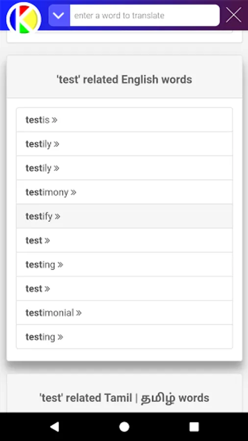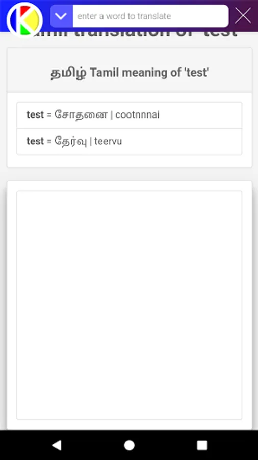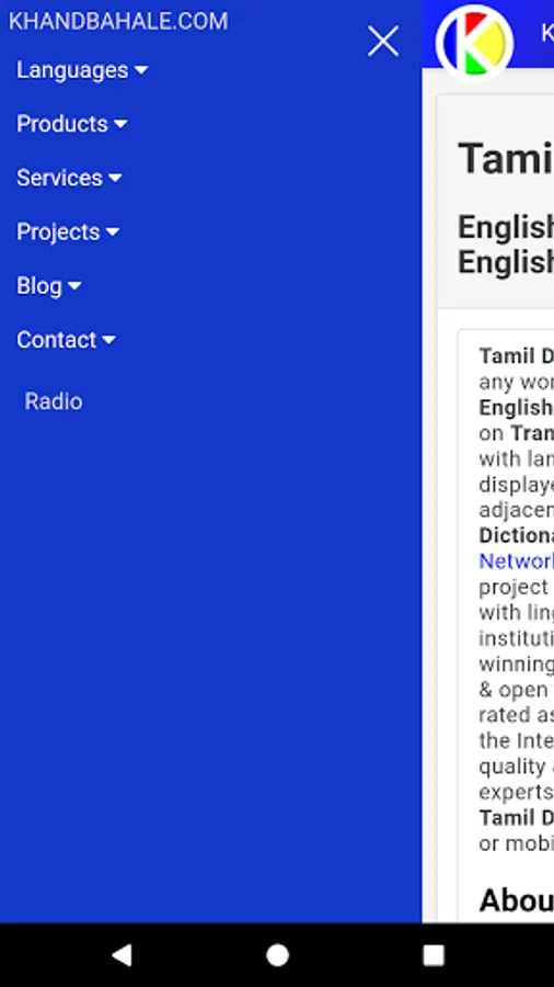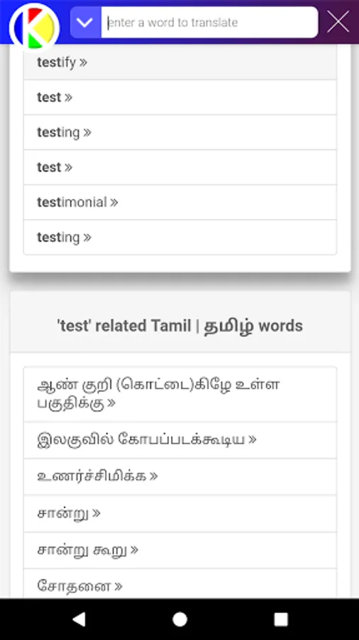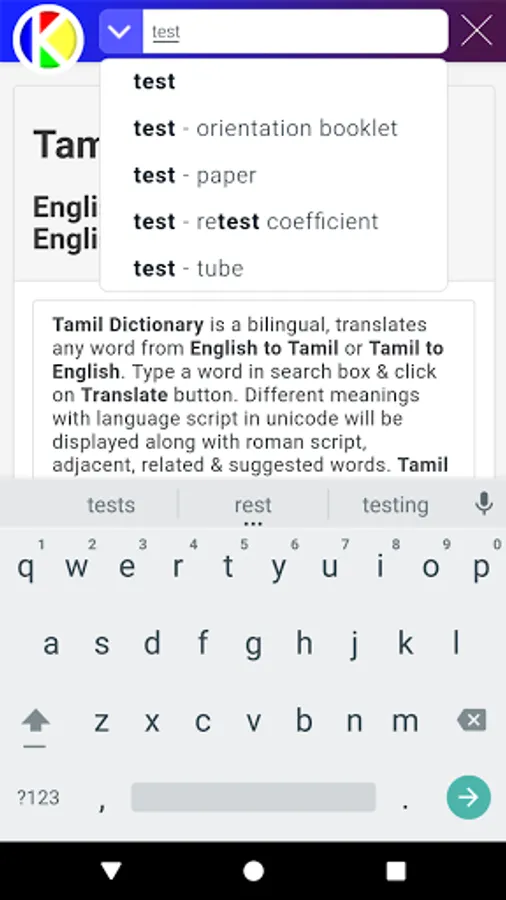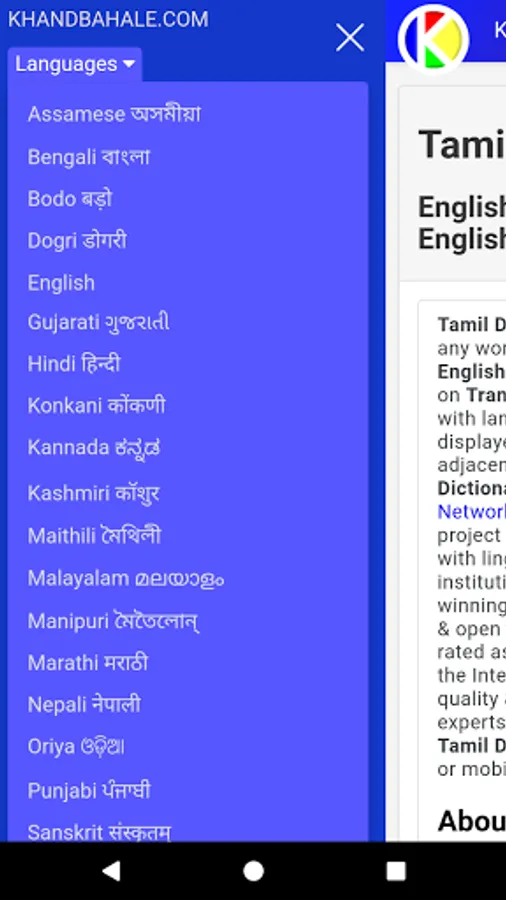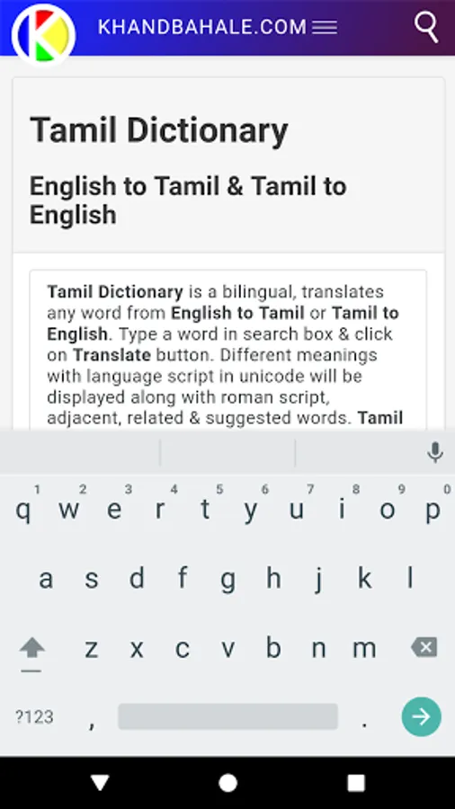 English to Tamil Dictionary is an Android App that includes an extensive vocabulary of 1,00,000+ words along with translated Tamil meanings. more at https://www.khandbahale.com/tamil