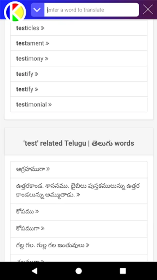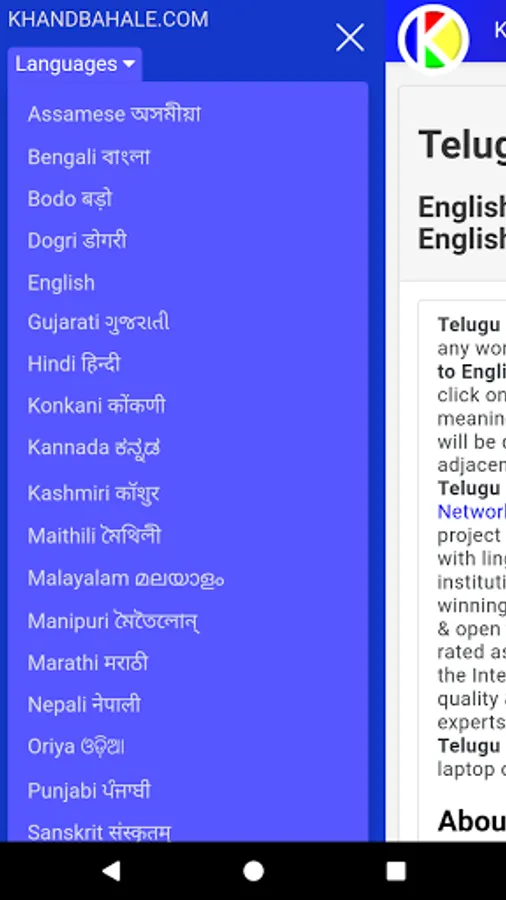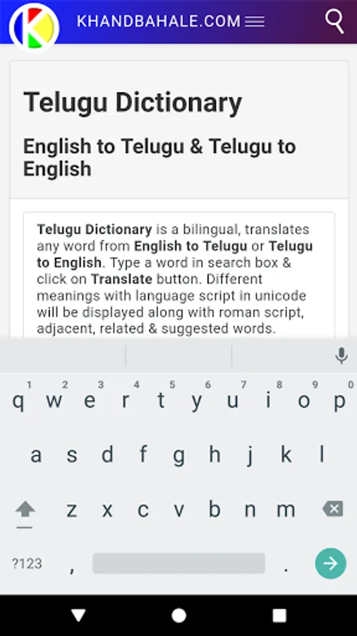 English to Telugu Dictionary is an Android App that includes the extensive vocabulary of 1,00,000+ words along with translated Telugu meanings. more at https://www.khandbahale.com/telugu