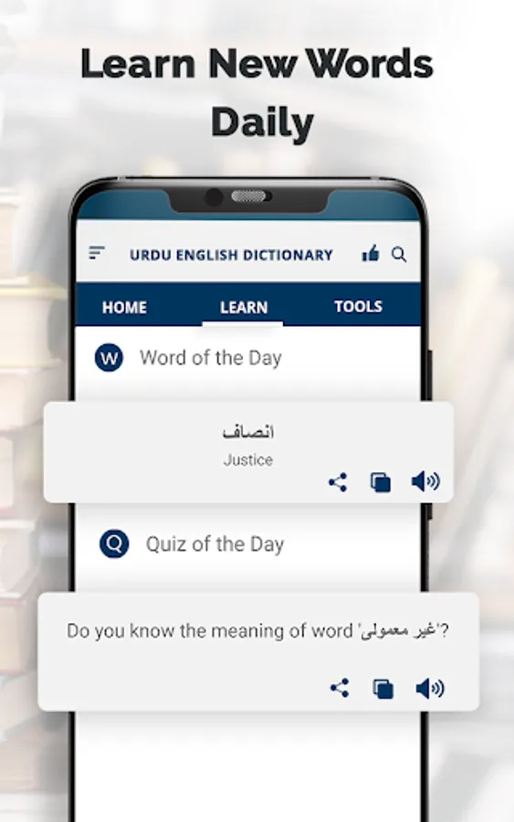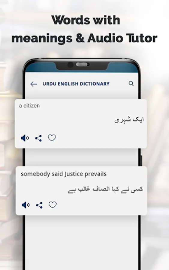 Urdu to English vocabulary learning app allows users to listen to the audio to text of that Urdu & English words (text to speech), helping users to learn the pronunciation of Urdu and English words.
