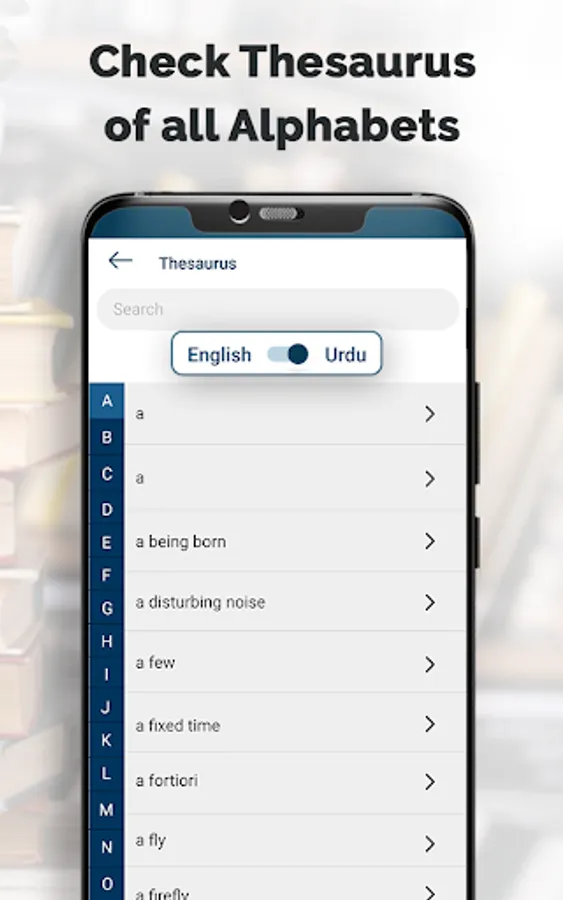 Urdu thesaurus alphabets keep in mind the ease of the user. This feature is included in Urdu to English Dictionary or English to Urdu Dictionary. Users can select any alphabet from the given suggestion list and all words with the desired alphabet will be displayed on the screen.