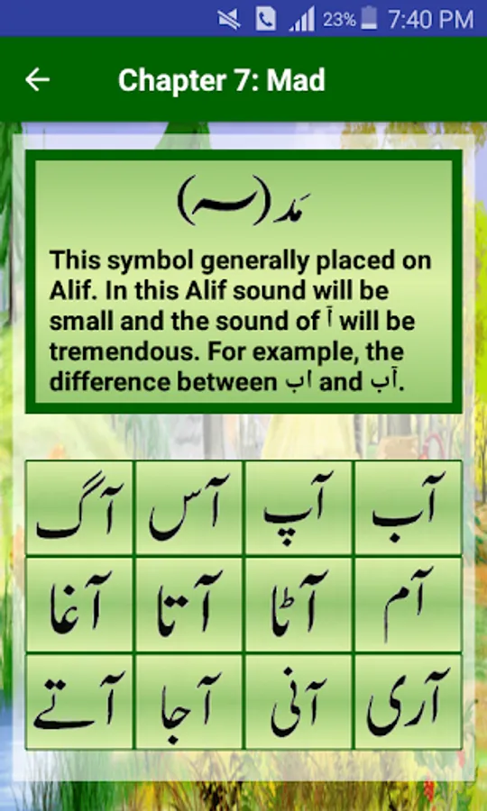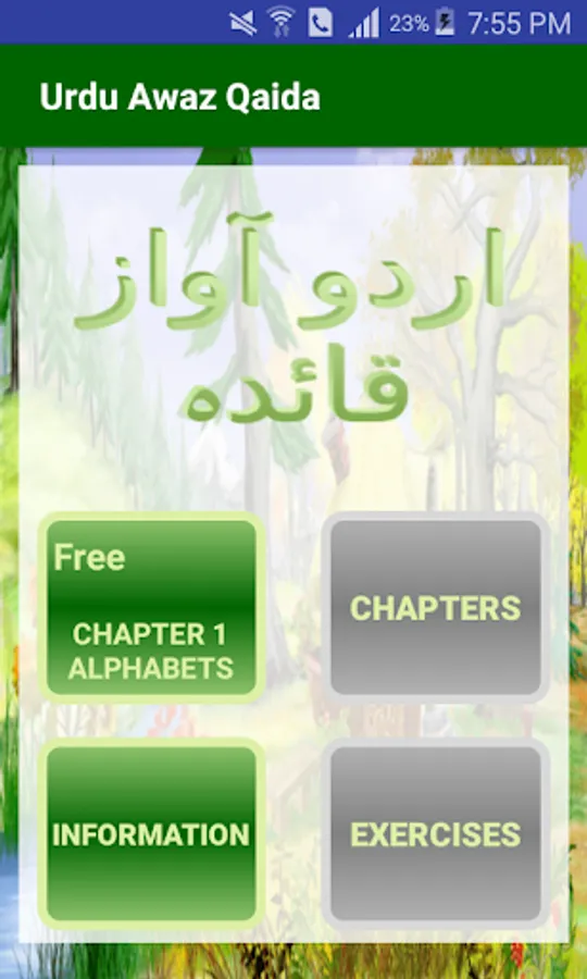 In urdu awaz qaida, urdu language will be taught through sound, pictures and writing. In this app there are 14 chapters and 4 exercises. Following are the names of 14 chapters: