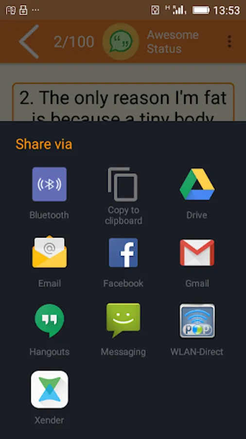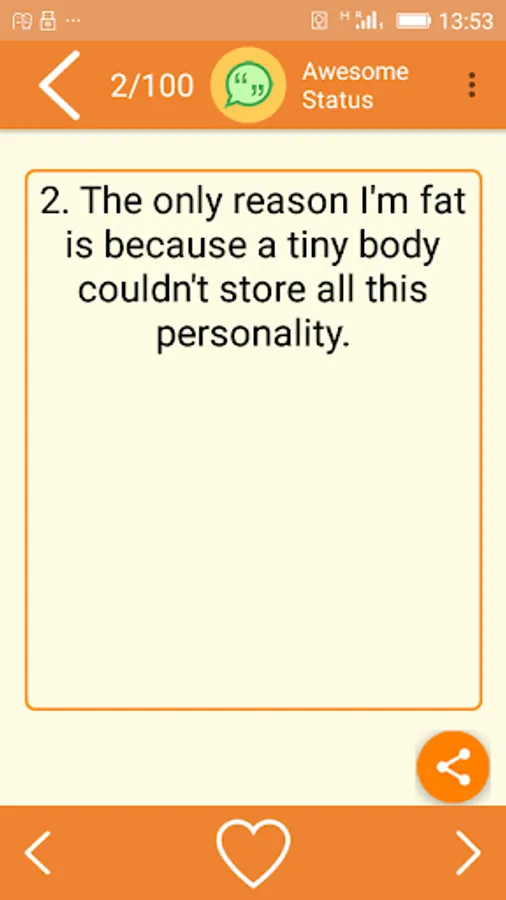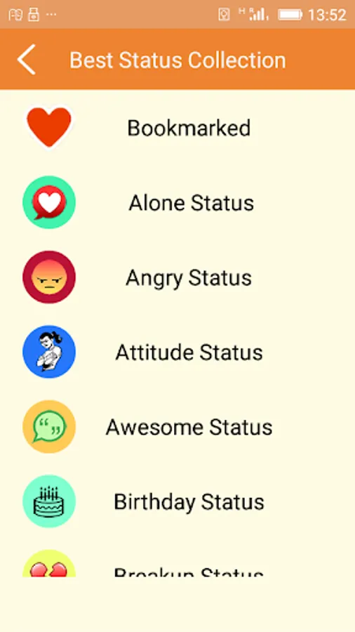 The best app and huge collection of statuses for all occasions for quick update status in social sites and for any chat .In this great Social Status Collection application have each and every categories of status like Funny statuses, Love statuses, New Year statuses, Sad statuses, Nice statuses, Man statuses, Woman statuses, Clever statuses, Life statuses, Joke statuses, Friend statuses and many more status are over there.