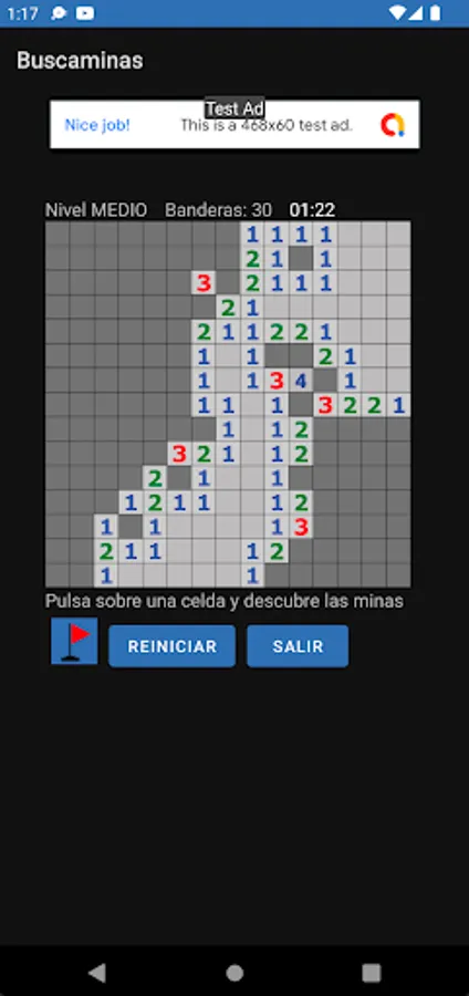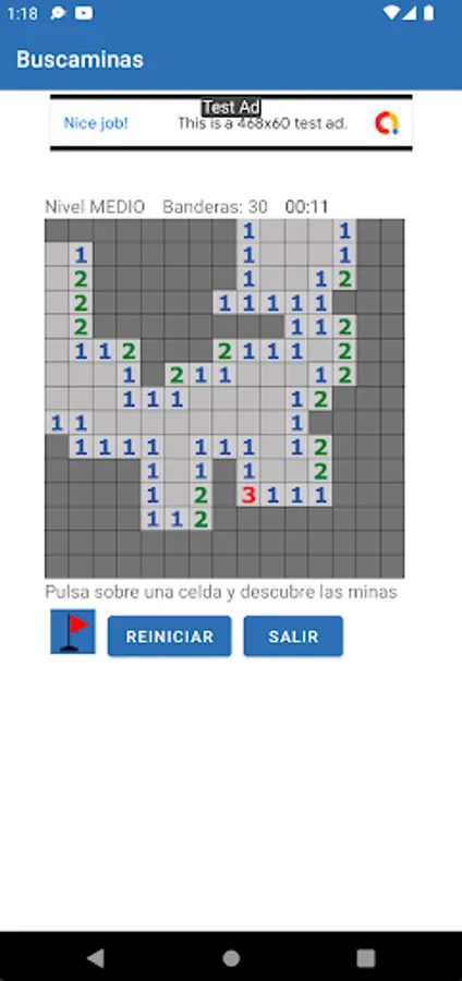 Minesweeper is an entertaining game that consists of finding all the mines displayed on a board. Discovering a cell indicates how many mines are in the adjacent cells. Thus, if a three appears, it means that there are mines in three of the eight cells adjacent to the discovered cell. Place flags on those cells where you think there are mines to mark and seal them.
