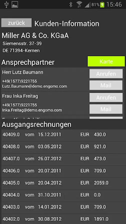 The configured in the demo environment display of customer data is only one of many examples which business data you can bring to your mobile device. For detailed information please visit us at www.engomo.com or contact us.