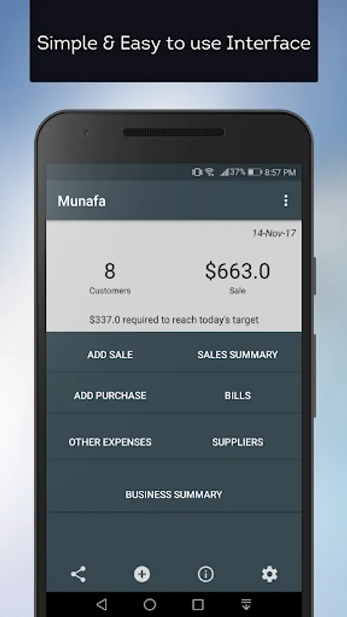 Munafa is a quick & simplified accounting/bookkeeping solution, specially designed for retail businesses. It keeps track of all business transactions like sales, purchases, other expenses and gives insight on business by providing daily, weekly, monthly & yearly statistics. It helps you to grow your business by setting a daily sale target and analyse if you achieved it or fell short of the target.