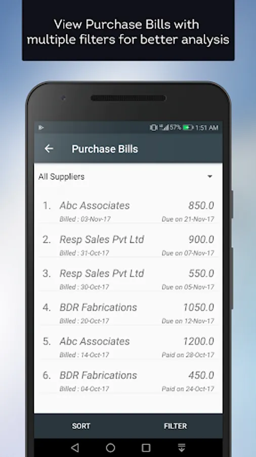 View all/paid/unpaid bills, filter & view bills supplier-wise, sort them by their bill date, to easily check the status & amount of all bills.
