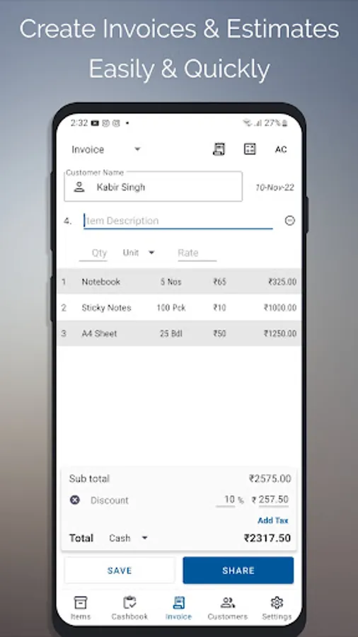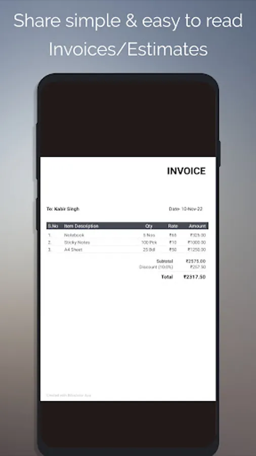 Create a PDF invoice/bill or estimate and share it right from the app.