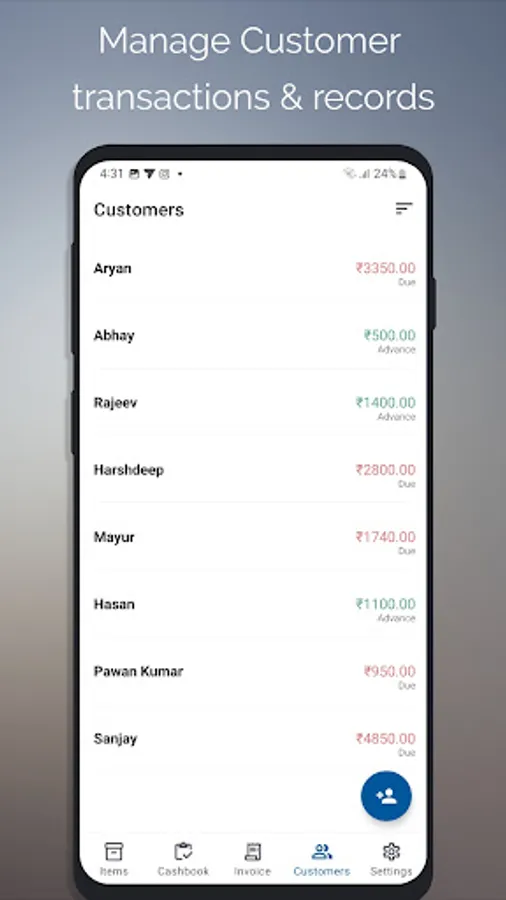 Manage your customers’ transactions & records with super ease. Sort option with different parameters to give you better access to the records. Also, as soon as you generate an invoice with a due payment, it automatically gets added to your customer’s records, saving your time to manually update them.