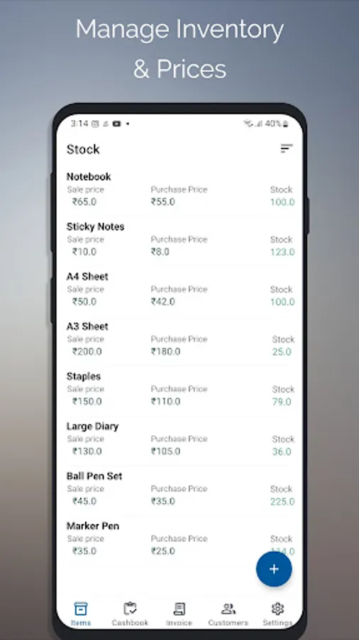 Add products with their sale/purchase price and manage inventory.