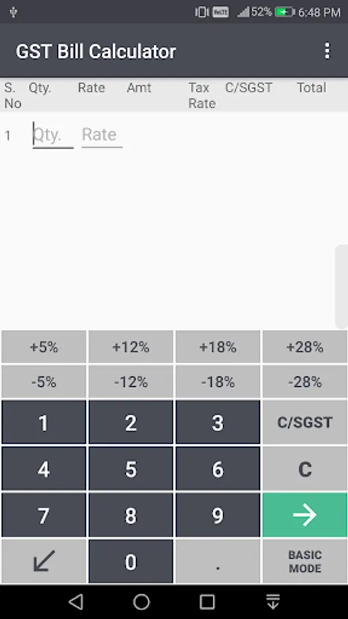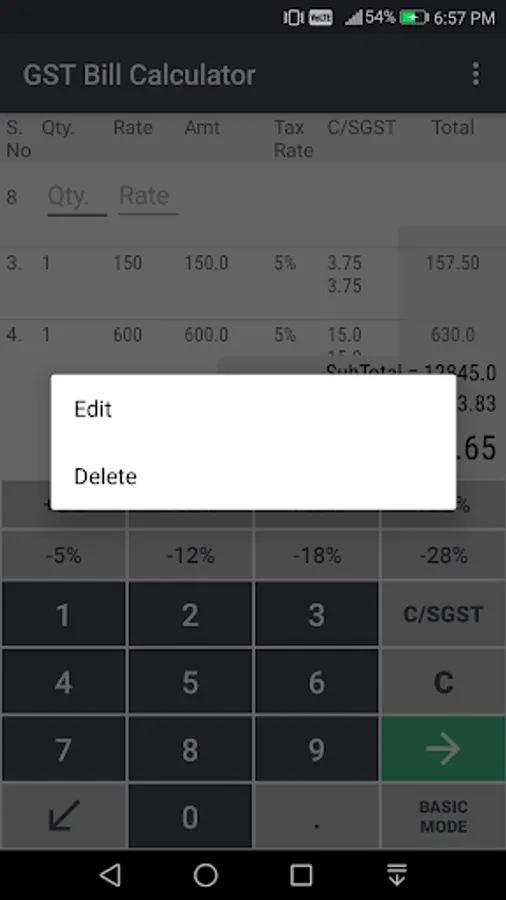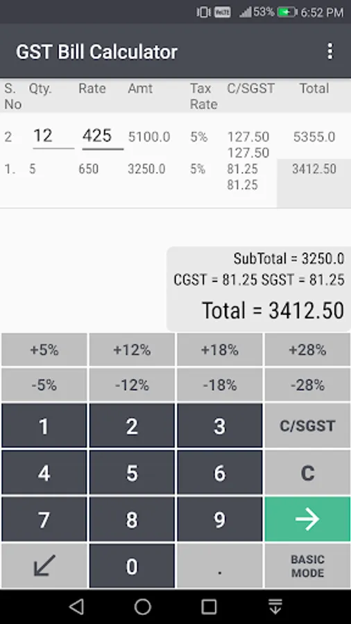 - Calculate GST on the complete bill in one go by long pressing any GST rate button.