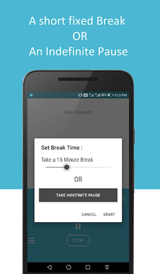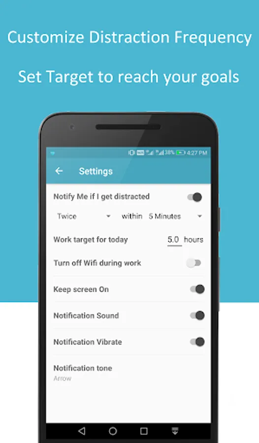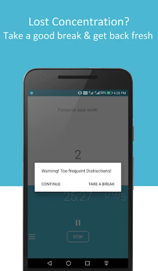 - Distraction counter which notifies when a distraction frequency is reached, with option to take a break or continue working.