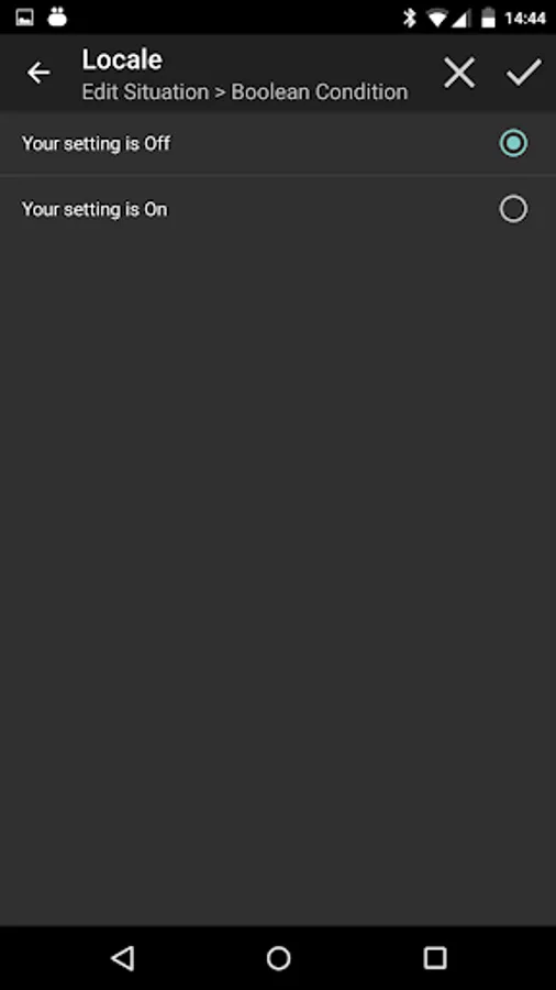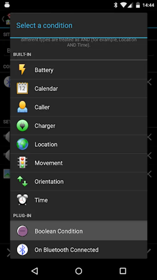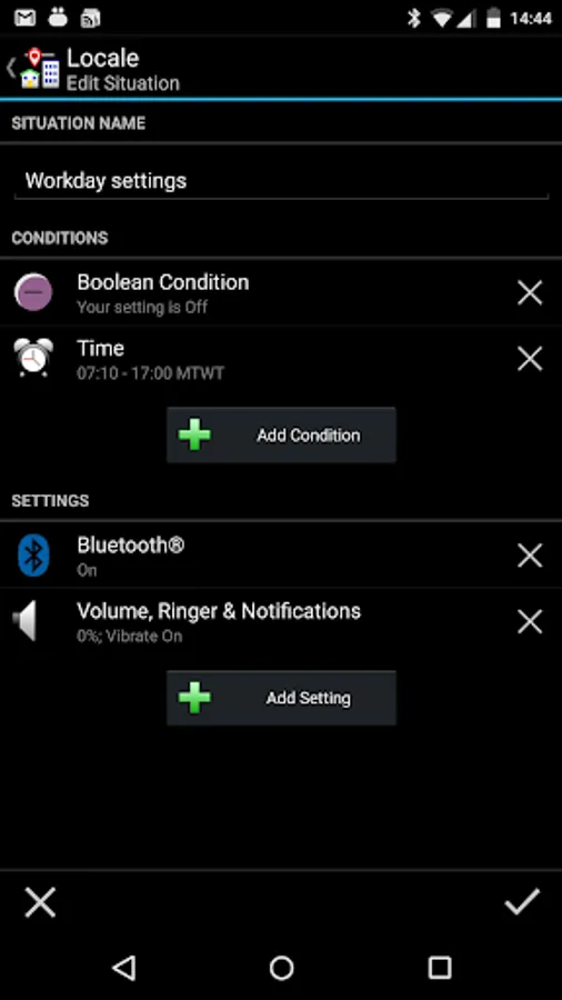 By adding the Boolean Condition to your "Situation", you can easily and temporarily disable or enable "Situations". This can be useful when a daily "Situation" is temporarily not applicable (like a work "Situation" when you are on vacation).