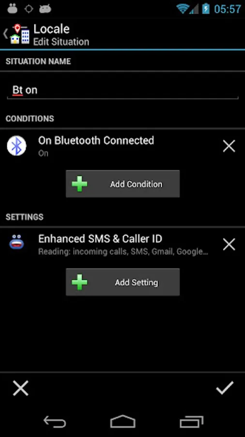 This Locale Bluetooth condition plugin will allow you to automatically change settings on your Android device based on connectivity to Bluetooth devices. For instance, perhaps you want your favorite voice notification app, Enhanced SMS & Caller ID+, to start up with certain settings when your Bluetooth headset connects. Or when you start your car and your device connects to your in-car Bluetooth, you may want the device volume to max out. The possibilities are endless!
