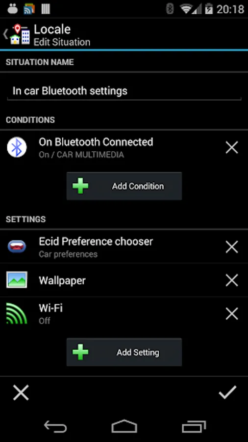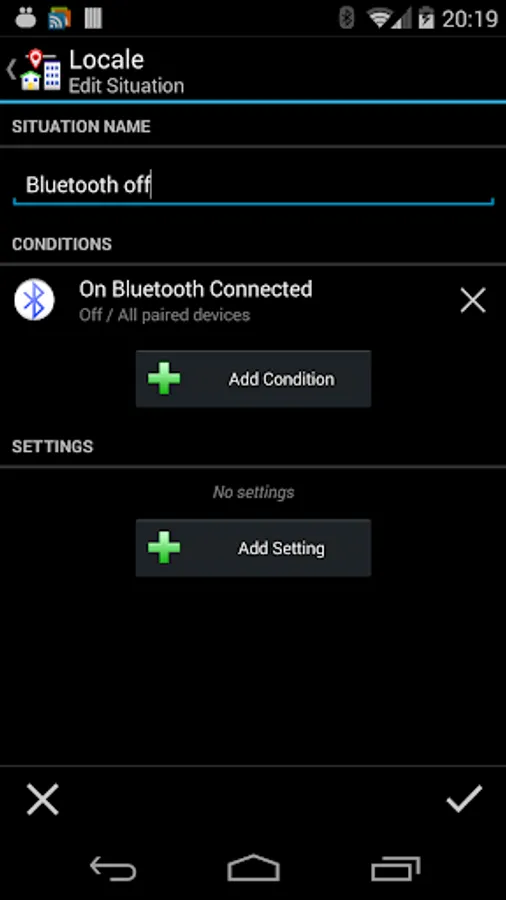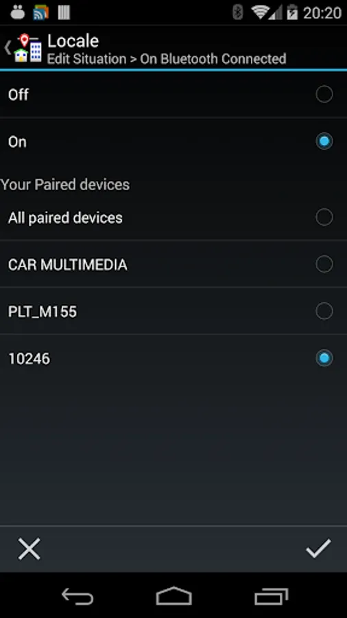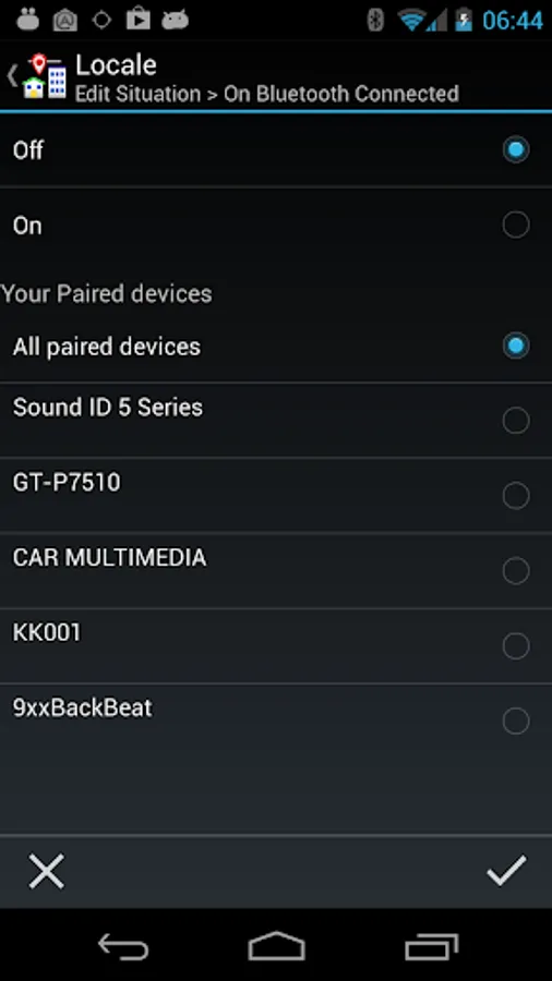The Locale Bluetooth On Connect condition plugin lets you choose settings on your Android device based on the connection, or lack of connection, to Bluetooth devices.