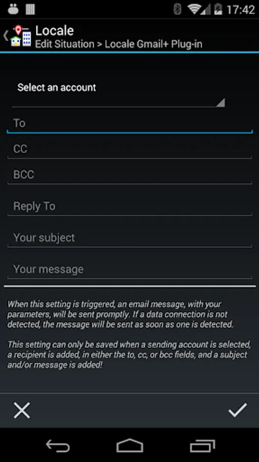 This Locale Gmail+ Plug-in is also be compatible with Tasker (sold separately by CRAFTY APPS), Settings Profiles Lite / Full (sold separately by probeez) and Llama (sold separately by KebabApps).