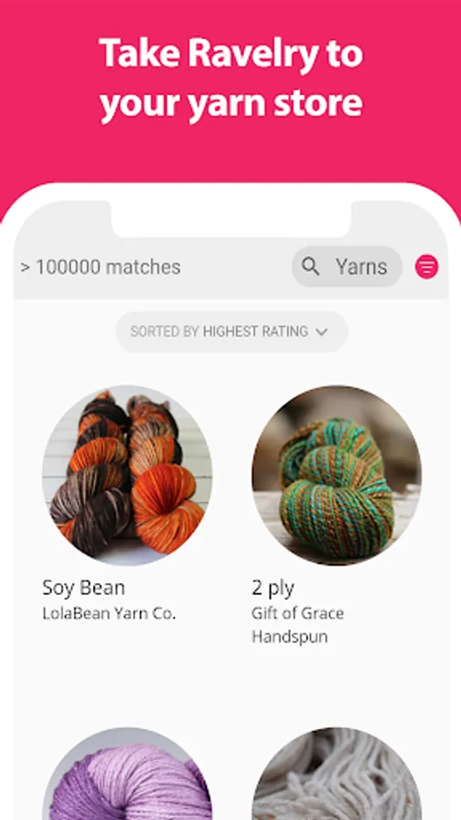 + Search all yarns by keyword, filter by fiber, weight, attributes and many others, and sort by options including 'Most projects' and 'Highest rating'. Quickly view pattern suggestions and projects for a yarn.