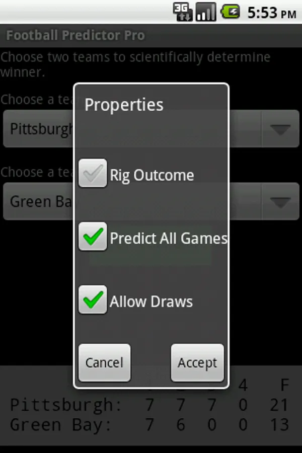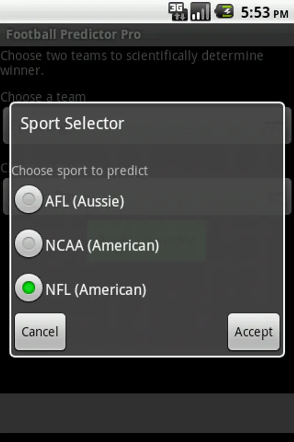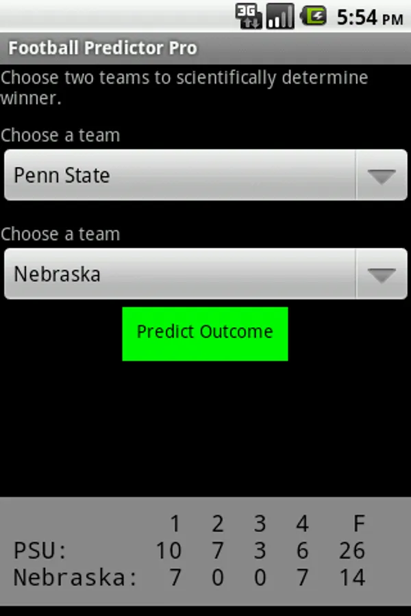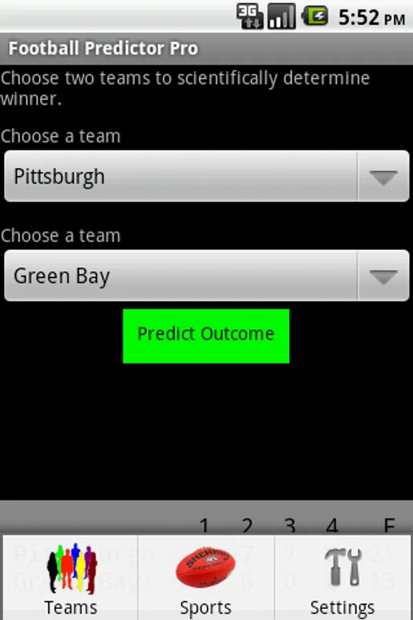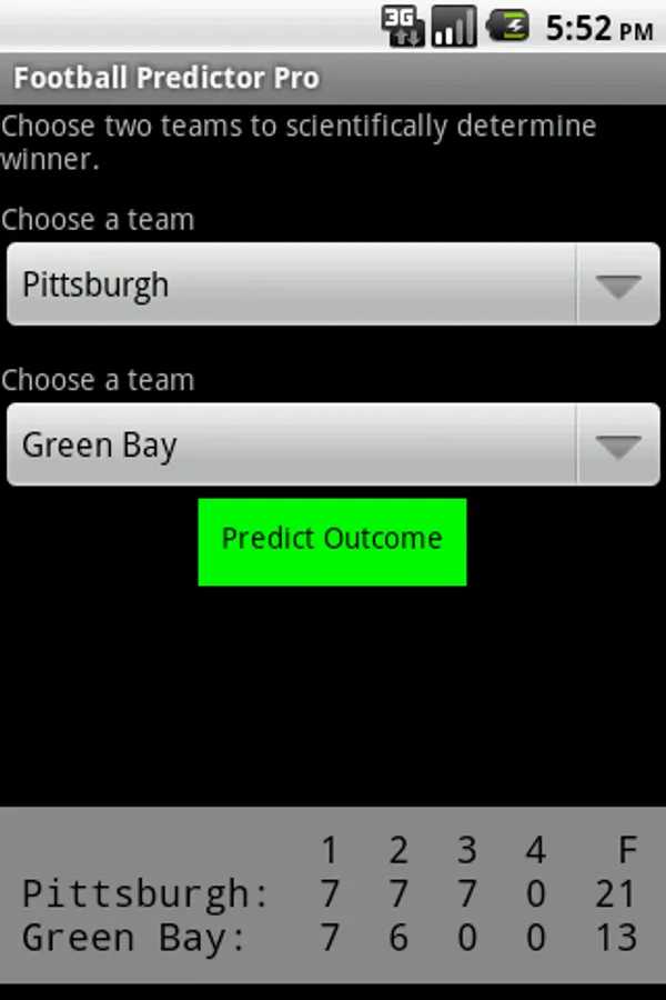 Football Predictor lets you scientifically* predict the outcome of Australian and American football games (pro and college), including points per quarter for American football and goals/behinds for Aussie rules. Football Predictor also lets you rig the prediction of your favorite and least favorite teams to mess with your friends.