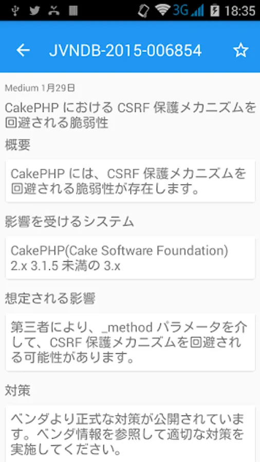 本アプリはJPCERT コーディネーションセンターと独立行政法人情報処理推進機構 (IPA)によって運営されているソフトウェアの脆弱性対策情報データベース JVN iPediaの脆弱性情報を検索することのできるアプリです。