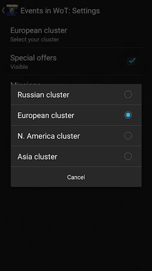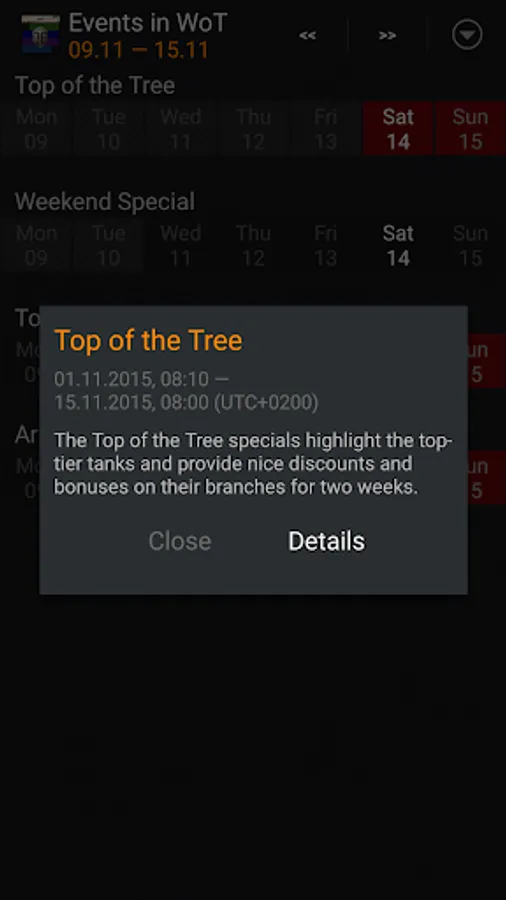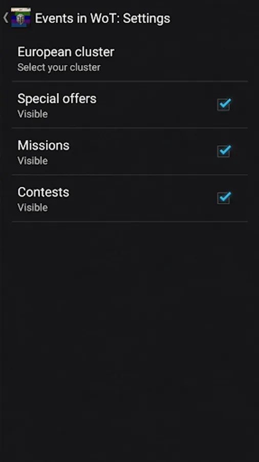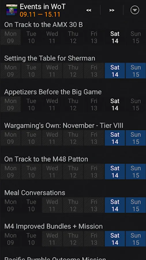 Now you can easily track all WoT events, on EU NA RU and ASIA clusters. With this application you will see all current, past and upcoming events of WoT, view precise duration of event, filter by event type. Support for offline events browsing.