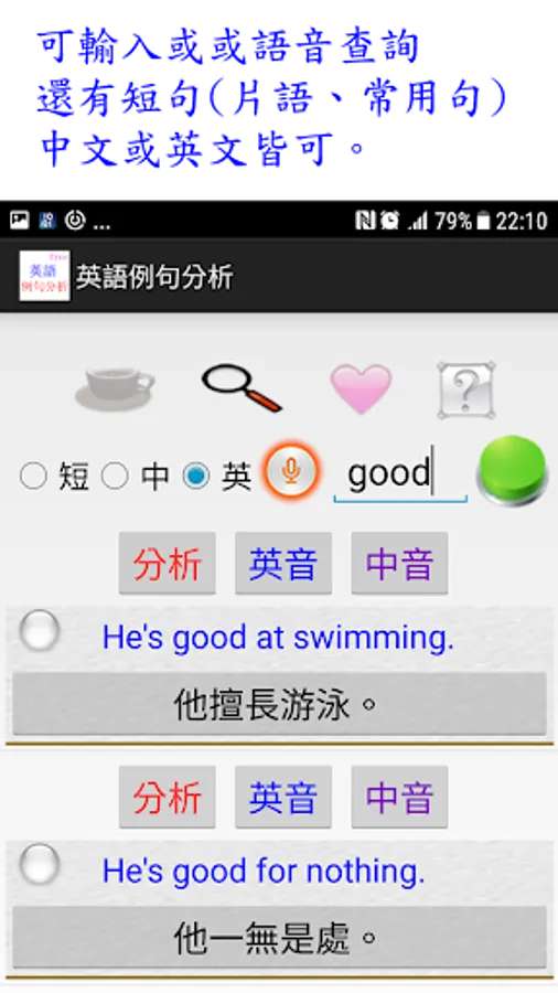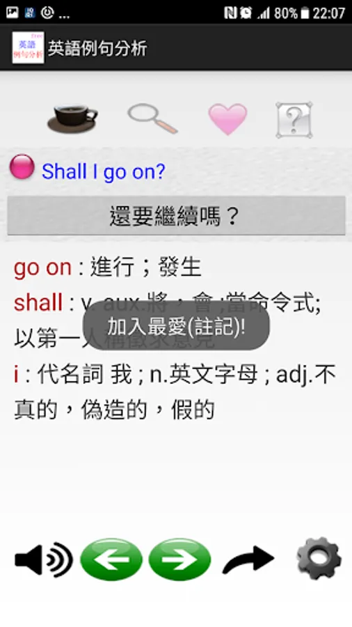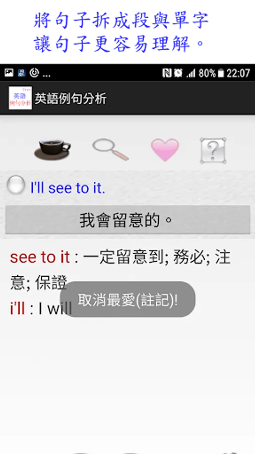 3.在一般功能時,可以將喜歡的句子加入最愛;亦可在查詢中去除最愛。