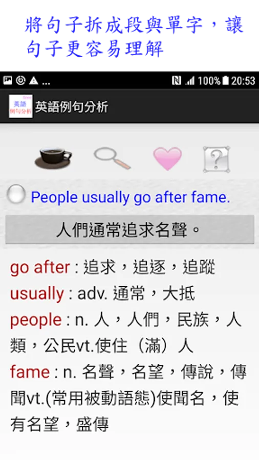 1.英語例句分析:是將句子拆成段與單字,讓句子更容易理解。段與單子皆有中文註解。