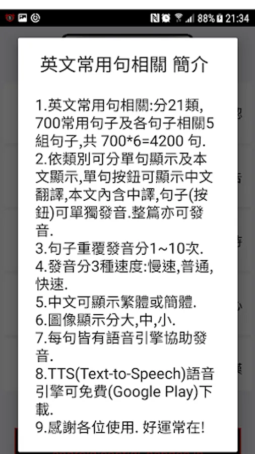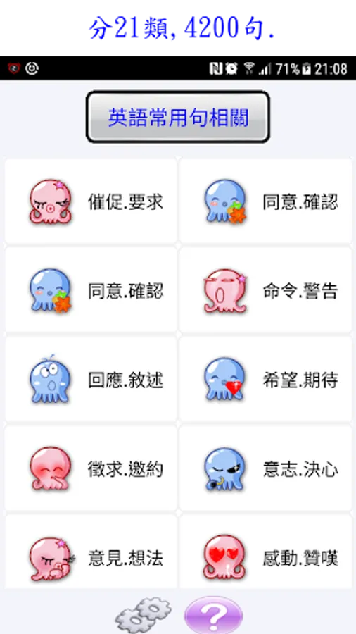 1.英文常用句相關:分21類,700常用句子及各句子相關5組句子,共 700*6=4200 句.