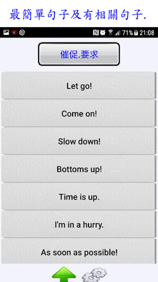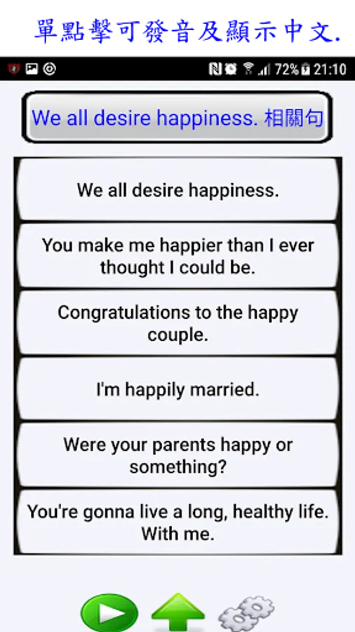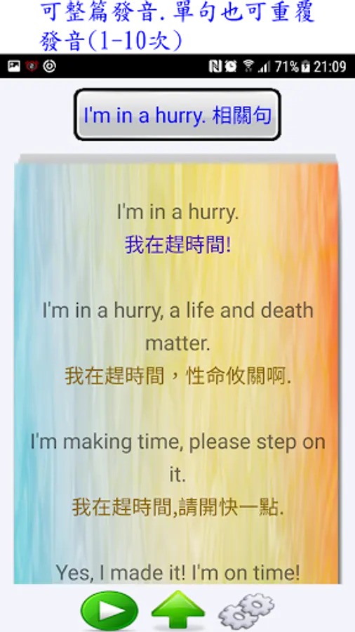 2.依類別可分單句顯示及本文顯示,單句按鈕可顯示中文翻譯,本文內含中譯,句子(按鈕)可單獨發音.整篇亦可發音.
