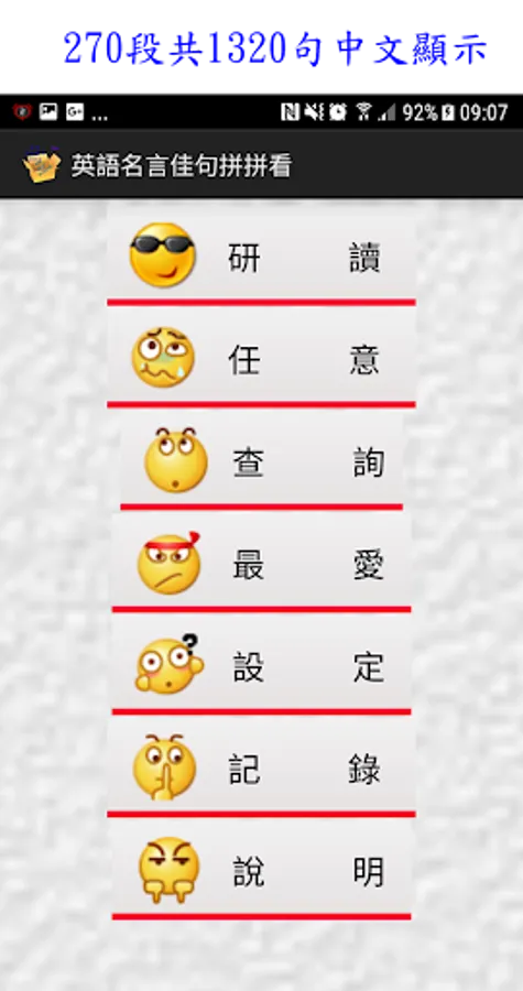2.共分270段,每段50句.排序方式以英文由短到長度排列.