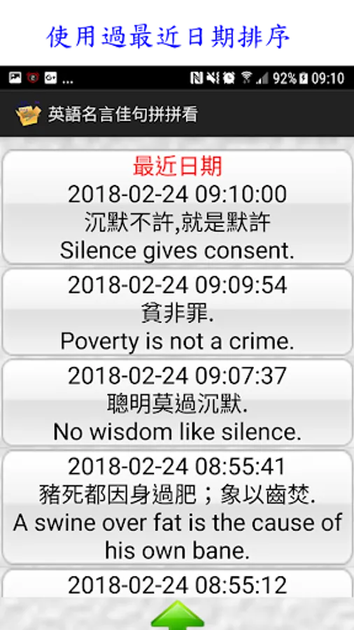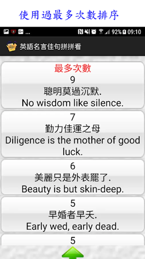 16.記錄:點過的句子會記錄,可分最近日期及次數最多排序.