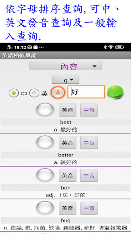 2.內容:單詞依字母排序查詢、可中、英文發音查詢及一般輸入查詢.