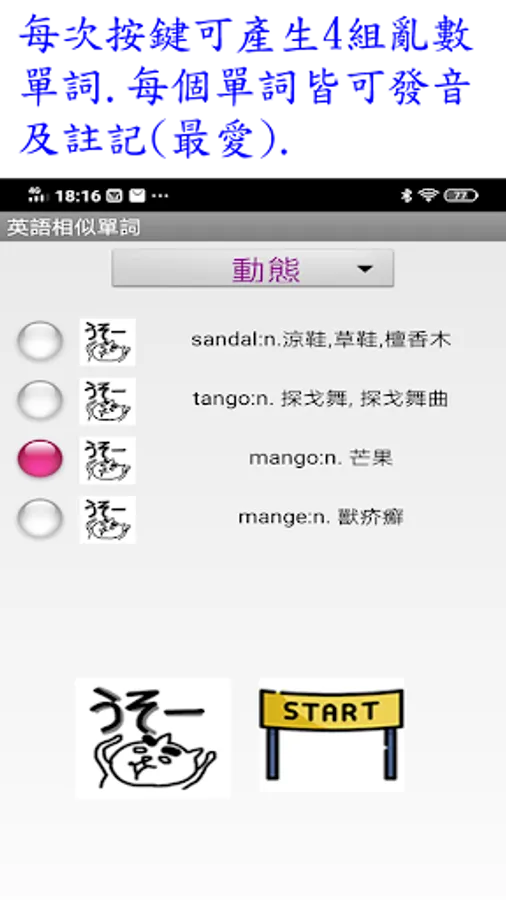 3.動態:每次按鍵可產生4組亂數單詞.每個單詞皆可發音.