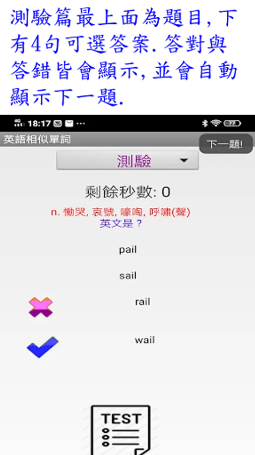 11.測驗篇最上面為題目,下有4句可選答案.答對與答錯皆會顯示,並會自動顯示下一題.