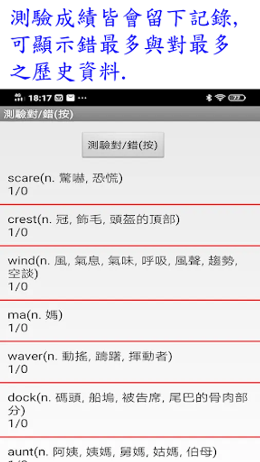 14.測驗成績皆會留下記錄,可顯示錯最多與對最多之歷史資料.