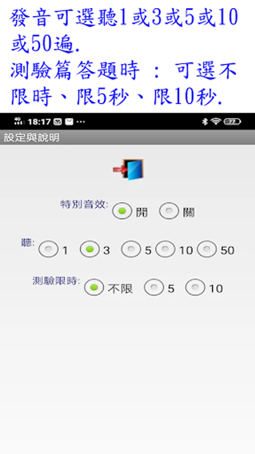 10.設定 : 發音可選聽1或3或5或10或50遍.