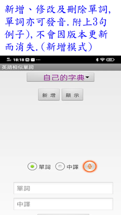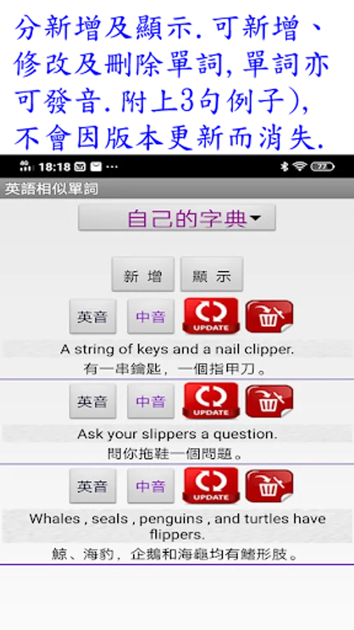 6.自己的字典 : 分新增及顯示. 可新增、修改及刪除單詞(句子也可),亦可發音.