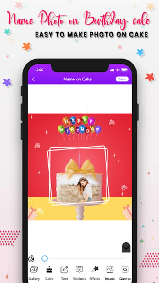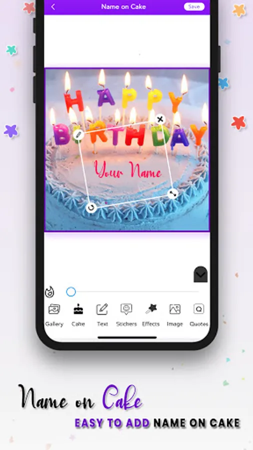 Name photo on cake is awesome feature to set photo on birthday cake and write name on cake. Just on click on text icon to add text on birthday cake.