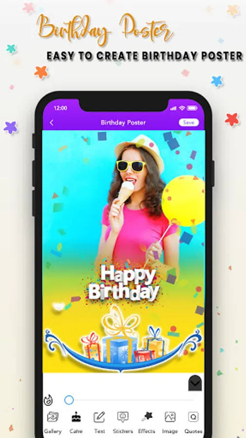 You celebrate birthday with birthday poster. Lots of birthday wishes with different sticker, quotes and color with set pic on cake using Birthday Cake name and photo app.