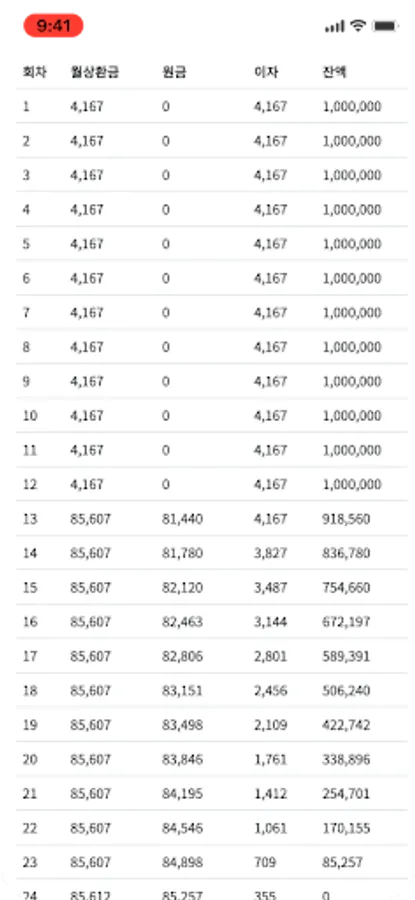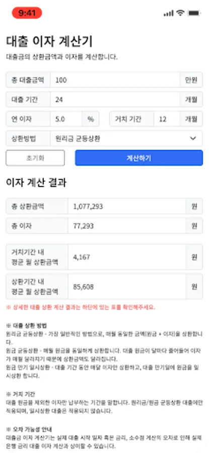 With the loan interest calculator, anyone can easily find out about the loan interest without entering other information by simply entering the loan amount, interest rate, and repayment period. Choose equal repayment of principal and interest, repayment at maturity, or equal repayment of principal and compare loans by each repayment method at a glance. With the click of a button, you can check the total loan interest, total repayment amount, interest and principal amount for each period, and even the amount to be paid.