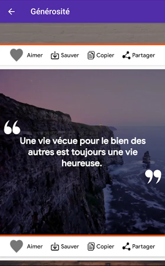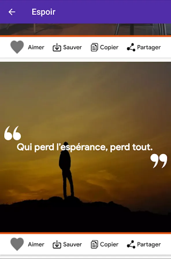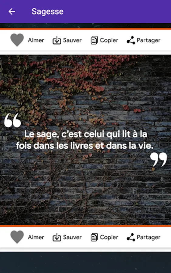 Our application "Quotes & Proverbs" brings together more than 3500 motivating and positive quotes for a good start to your day. Quotes and proverbs are a source of wisdom, poetry and courage to achieve our goals and realize our dreams. Thanks to these short sentences, we see life differently, with more philosophy and they help us get through difficult times.