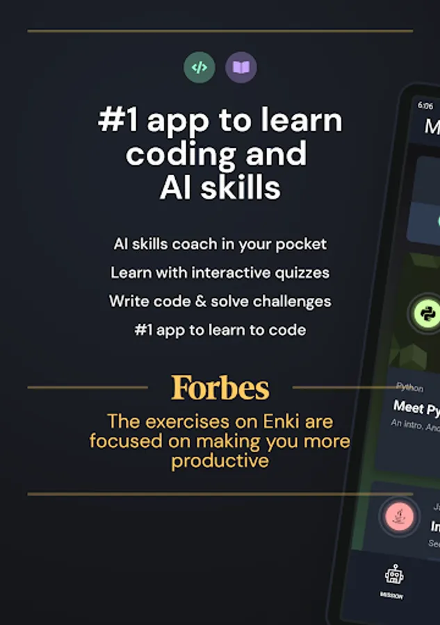 "The app supports everyone from beginners to more experienced coders. You can almost think of Enki the same way you would an exercise app. It provides you with daily workouts, but here youβre leveling up your coding skills instead of burning fat and building muscle."