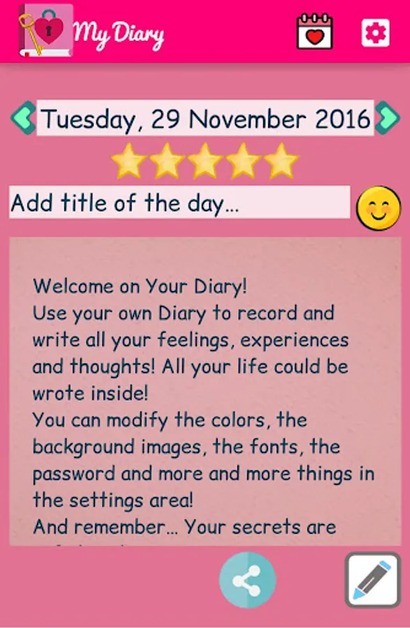 Enjoy and have fun! Play & enjoy with your friends and share all you want of "THE DIARY WITH LOCK" on Facebook, WhatsApp, Twitter, Email, SMS and so on!