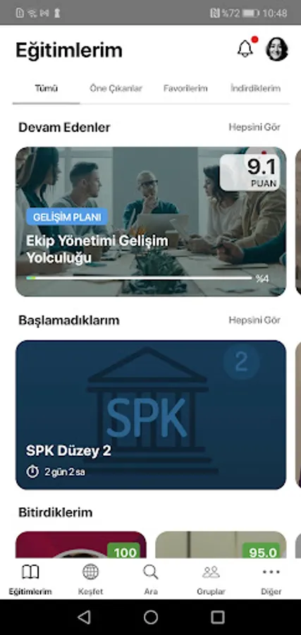 You can see all the resources defined for you under the "My Trainings" heading in the application, and you can access all appropriate content by typing the competency you want to develop in the "What do you want to learn" field from the "Search" section. You can immediately start watching the outstanding trainings of that period from the "Discover" area.