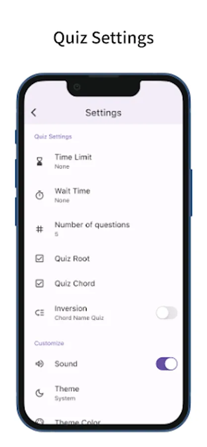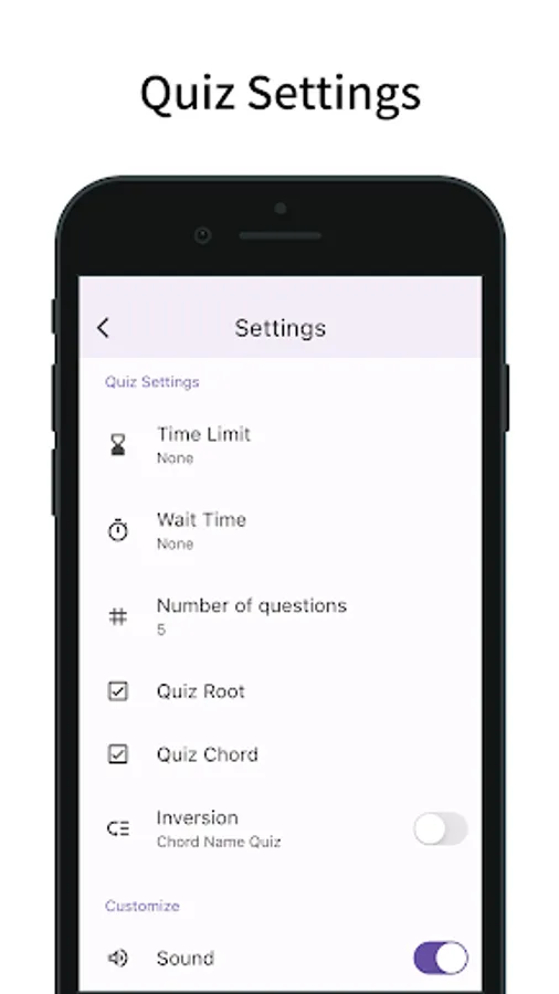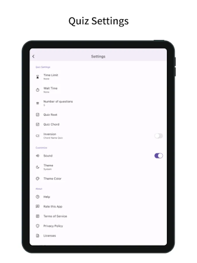 - Quiz settings (time limit, waiting time, number of questions, root note of question, chord of question, inversion form)