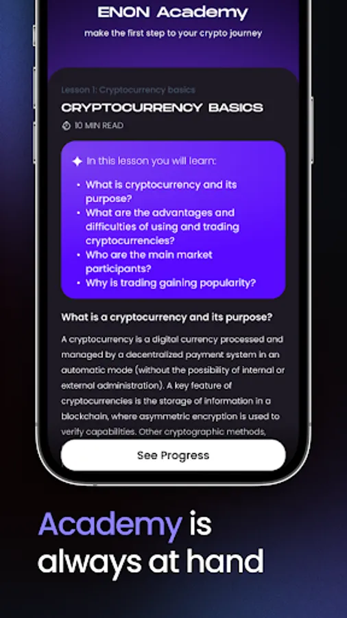 Get all the most essential information about crypto in each lesson, from trading psychology for pros to basic information for new. Find what you need for trading in our Academy. 8 lessons with detailed description, examples, and explanations. With ENON, it is easy to start crypto education!